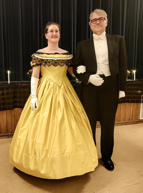 Bustle 1880 ballkjole i gullstripet silke, XL -