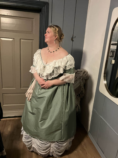 1880 bustle dagantrekk, beige og grønn. XL -